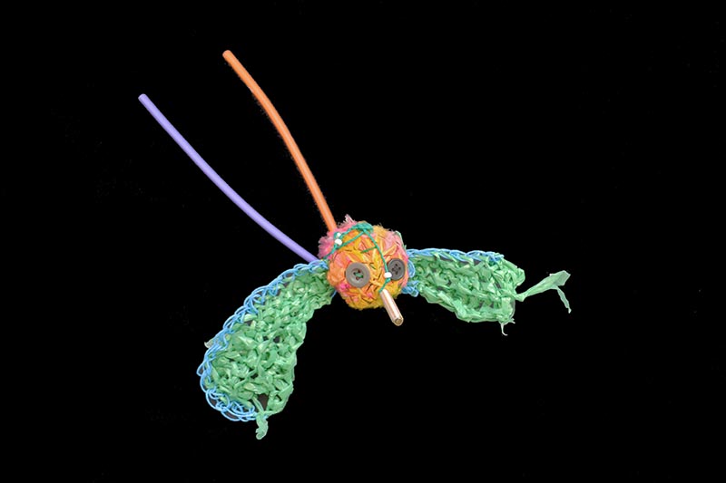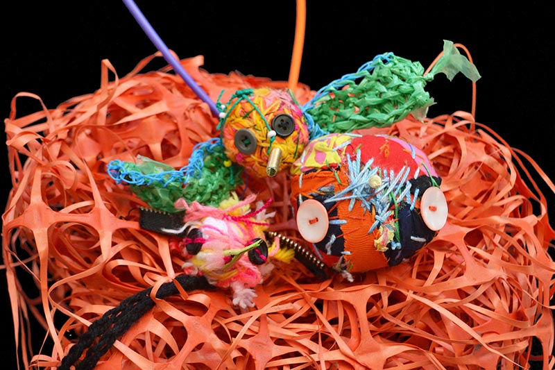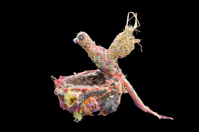 La muestra despliega fibras naturales, lanas e hilos que se convierten en territorios habitados por pájaros, insectos y seres blandos. Cada puntada es un gesto que enlaza y sostiene, como en un ecosistema donde lo pequeño y lo inmenso dialogan en una red invisible de afectos.