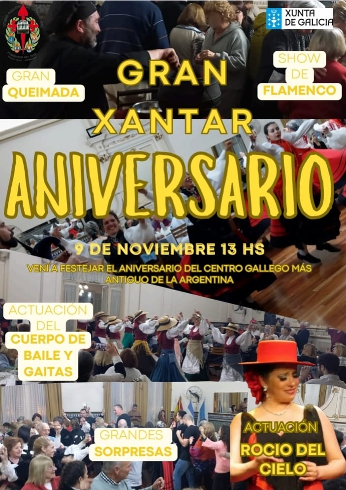 El festejo principal será un gran xantar (almuerzo) que se realizará el domingo 9 de noviembre a las 13 horas en la sede de la institución, ubicada en Av. Mitre 780. La jornada contará con la participación del cuerpo de baile y los gaiteros del centro, y una actuación especial de Rocío del Cielo, en un ambiente festivo que promete reunir a socios, vecinos y amantes de la cultura gallega.