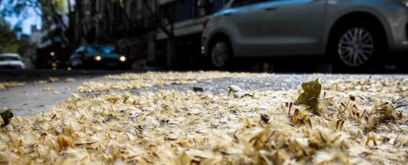 Las semillas del plátano de sombra se agrupan en esferas marrones que permanecen en el árbol durante el otoño y el invierno. Con la llegada de la primavera, estas estructuras se desintegran y liberan pequeños frutos secos llamados aquenios, cada uno rodeado por una fina corona de tricomas, los “pelos” visibles. Estos son los encargados de facilitar su dispersión con el viento y dar lugar a nuevos árboles. Cuando las fibras flotan en el aire, pueden irritar las vías respiratorias, los ojos y la piel de quienes se cruzan con ellas, aun sin ser alérgicos.