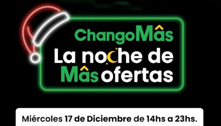 Este miércoles 17 de diciembre las sucursales Híper ChangoMâs, ChangoMâs y Punto Mayorista del país permanecerán abiertas hasta las 23hs con ofertas, descuentos y financiación especial desde las 14 horas. Todas estas promociones y descuentos también estarán disponibles en la tienda digital MâsOnline para todo el país.