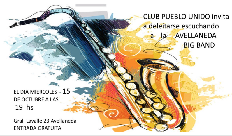 Este miércoles 15 de octubre a las 19 horas, el Club Pueblo Unido abrirá sus puertas para recibir a la reconocida Avellaneda Big Band, en una velada musical que promete ritmo, talento y espíritu comunitario. El evento se llevará a cabo en la sede del club, ubicada en Lavalle 23, Avellaneda, y la entrada será completamente gratuita.