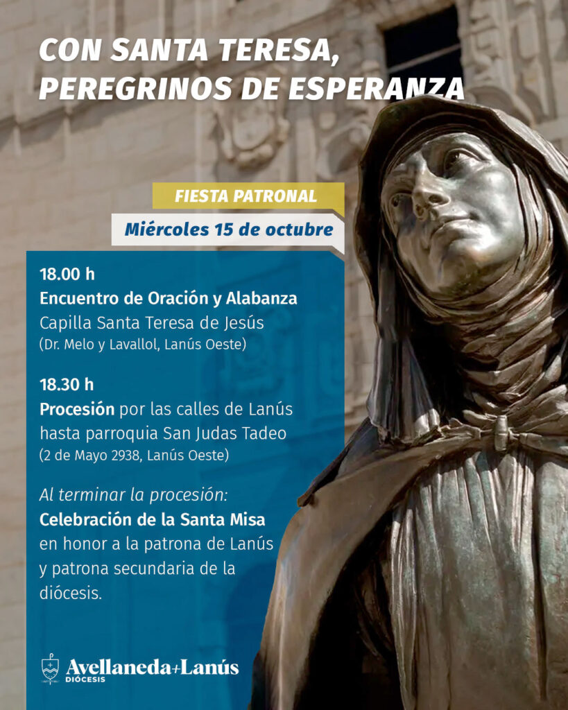 La primera cita será el miércoles 15 de octubre en honor a Santa Teresa de Ávila, patrona secundaria de la diócesis y patrona de Lanús. La jornada comenzará a las 18:00 h con un encuentro de oración y alabanza en la Capilla Santa Teresa de Jesús (Doctor Melo y Lavallol, Lanús Oeste). A las 18:30 h, se iniciará una procesión por las calles del barrio hasta la Parroquia San Judas Tadeo (2 de Mayo 2938), donde se celebrará la Santa Misa concelebrada por todo el presbiterio diocesano.