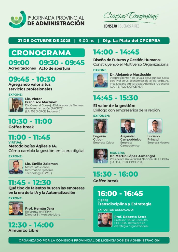 El viernes 31 de octubre, desde las 9, se pondrá en marcha la 1° Jornada Provincial de Administración, organizada por la Comisión Provincial de Licenciados en Administración del Consejo Profesional de Ciencias Económicas bonaerense.