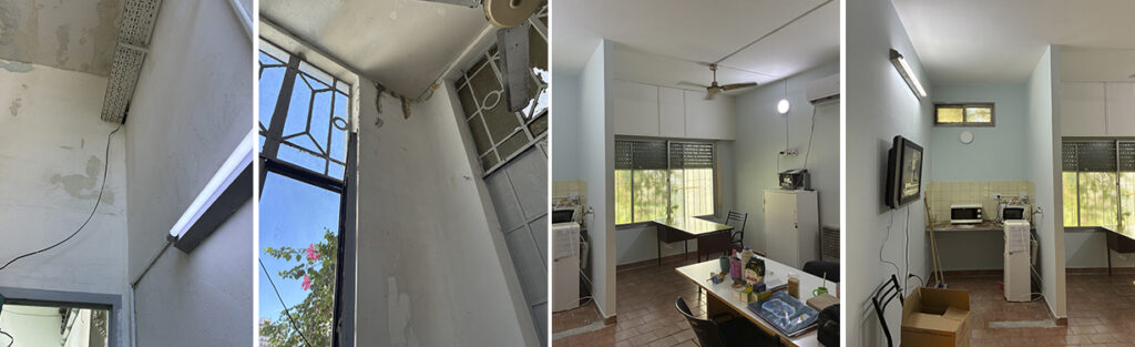 Tras las reformas estructurales, se procedió al acabado final de las superficies. Según detalló la Arquitecta Ana María Reyes, responsable del proyecto, se realizó un trabajo minucioso de enduido y lijado, culminando con la pintura de muros, cielorrasos y carpinterías en ambos sectores.