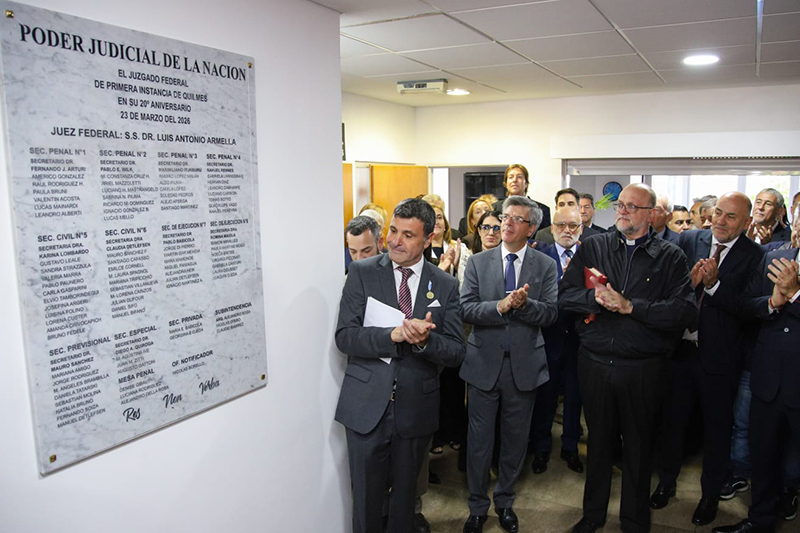 El Juzgado Federal de Primera Instancia de Quilmes celebró su vigésimo aniversario con un acto institucional que reunió a autoridades locales y referentes de la región. Entre los presentes estuvieron el intendente de Avellaneda, Jorge Ferraresi; el presidente del Honorable Concejo Deliberante de Avellaneda, Hugo Barrueco y el Secretario Legal y Técnico de la Municipalidad de Avellaneda Sergio Ceballos, quienes participaron de la ceremonia junto al titular del tribunal, el juez Luis Antonio Armella, anfitrión del encuentro.