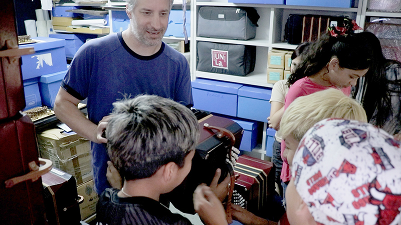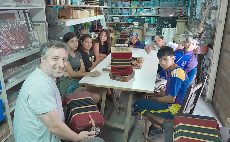 Uno de los momentos centrales del taller es la explicación del funcionamiento del instrumento. “El fuelle cumple la misma función que los pulmones. Cuando abrimos, entra aire; cuando cerramos, sale”, explicó Humar. “Ese aire pasa por unas chapitas de metal, las lengüetas, que vibran y generan el sonido. Es muy parecido a una armónica en su lógica”.