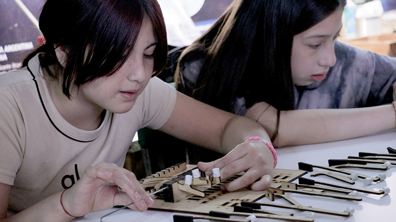 Divididos en grupos, los chicos desmontaron y volvieron a armar el sistema de palancas utilizando elementos simples. “No usamos cosas raras: hay rayos de bicicleta, piezas numeradas. La idea es mostrar que se puede”, subrayó.