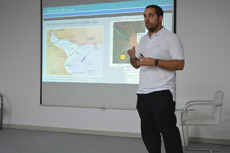 La primera fue dictada por el Mgtr. Esp. Ing. Gabriel Tryfón, Supervisor Cloacal en Aguas y Saneamientos Argentinos (AySA), que se refirió inicialmente a los Objetivos de Desarrollo Sostenible presentados para 2030 por la ONU, vinculado con el Objetivo 6, en relación con la necesidad de alcanzar la universalidad del acceso al agua potable, el saneamiento y sobre servicios de higiene. “Es fundamental un saneamiento adecuado para prevenir enfermedades y muertes”, aseguró acerca del proceso de gestión hídrica, demostrado con estadísticas nacionales e internaciones sobre diversos estudios científicos, y detalló también el desarrollo de plantas potabilizadoras y depuradoras en el AMBA, con sus alcances y características.